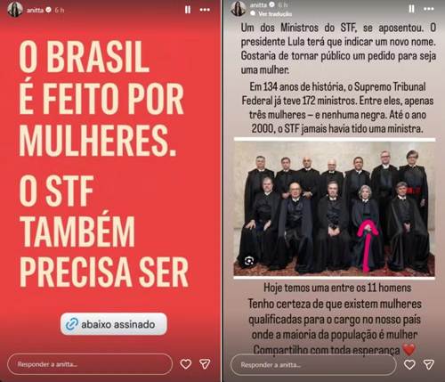 Nos últimos dias, diversas artistas de peso aderiram à campanha para que uma magistrada ocupe o lugar deixado pelo ministro Luís Roberto Barroso. Além de Anitta, que realizou publicações sobre o tema na terça-feira (14), nomes como Fernanda Torres, a cantora e ex-BBB Juliette e a atriz Bruna Griphao usaram as redes sociais para se manifestar. A indicação será feita pelo presidente Lula (PT).