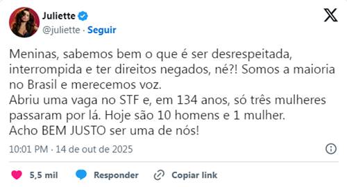 A cantora Juliette afirmou que as mulheres sabem como é ser “desrespeitada, interrompida e ter direitos negados” mesmo sendo “a maioria no Brasil”. De acordo com a ex-BBB, devido ao cenário desigual, é “bem justo” que Lula indique uma ministra.