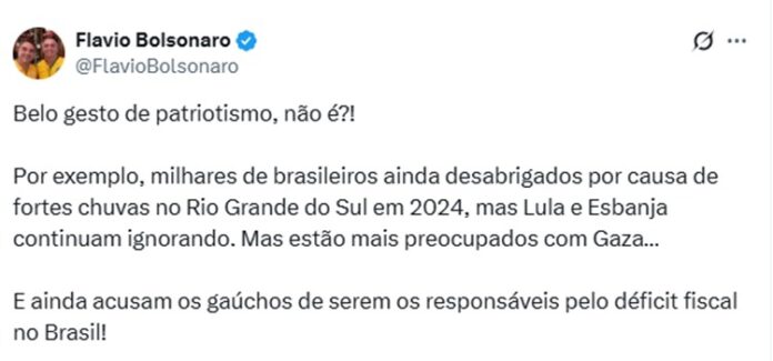 Através do X, (antigo Twitter), Flávio Bolsonaro compartilhou uma manchete da Jovem Pan que citava a ajuda do Brasil a Gaza, liderada por Janja e Lula. “Belo gesto de patriotismo, não é?! Por exemplo, milhares de brasileiros ainda desabrigados por causa de fortes chuvas no Rio Grande do Sul em 2024, mas Lula e Esbanja continuam ignorando. Mas estão mais preocupados com Gaza… E ainda acusam os gaúchos de serem os responsáveis pelo déficit fiscal no Brasil!“, escreveu ele, acusando ambos de ‘negarem’ ajuda aos gaúchos em um momento de calamidade.