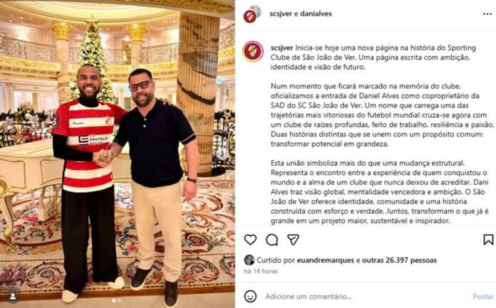 “Num momento que ficará marcado na memória do clube, oficializamos a entrada de Daniel Alves como coproprietário da SAD do SC São João de Ver. Um nome que carrega uma das trajetórias mais vitoriosas do futebol mundial cruza-se agora com um clube de raízes profundas, feito de trabalho, resiliência e paixão. Duas histórias distintas que se unem com um propósito comum: transformar potencial em grandeza“, afirmaram.