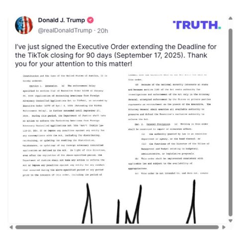 Em uma publicação na rede social Truth Social, o presidente escreveu: “Acabei de assinar a Ordem Executiva que prorroga o prazo para o fechamento do TikTok por 90 dias (17 de setembro de 2025)“, publicou Trump. O governante norte-americano já havia adiado duas vezes a proibição do TikTok no país, determinada pelo Congresso, que deveria entrar em vigor em janeiro.