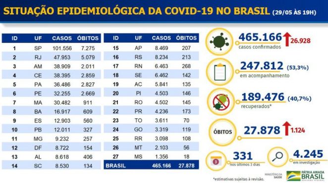 O Ministério da Saúde divulgou nesta sexta-feira (29) que o Brasil registrou mais 1.124 mortes pelo novo coronavírus, Covid-19, nas últimas 24 horas, elevando o número total para 27.878. Com isso, torna-se o quinto país com mais óbitos pela doença em todo o mundo, ultrapassando a Espanha (27.121 vítimas).