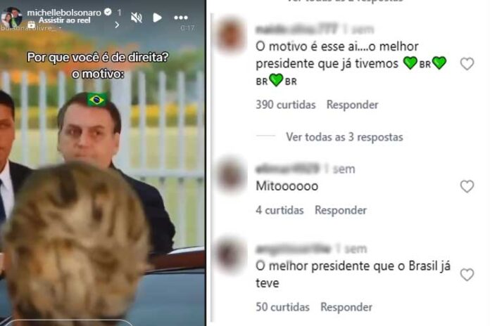 Michelle Bolsonaro publicou um vídeo em seu perfil no Instagram, nesta terça-feira (16), explicando por que se considera uma pessoa de direita. Nas imagens, o ex-presidente Jair Bolsonaro aparece cumprimentando eleitores e participando de vários eventos como motociatas e cumprimento de agendas.