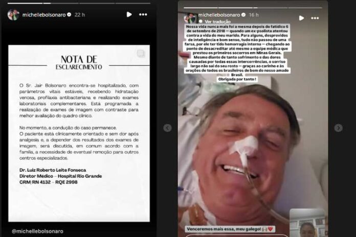 Michelle Bolsonaro também publicou uma nota do Hospital Rio Grande informando o estado de saúde de Jair Messias Bolsonaro. O texto diz que o ex-presidente segue com quadro estável recebendo hidratação venosa e realizando exames laboratoriais.