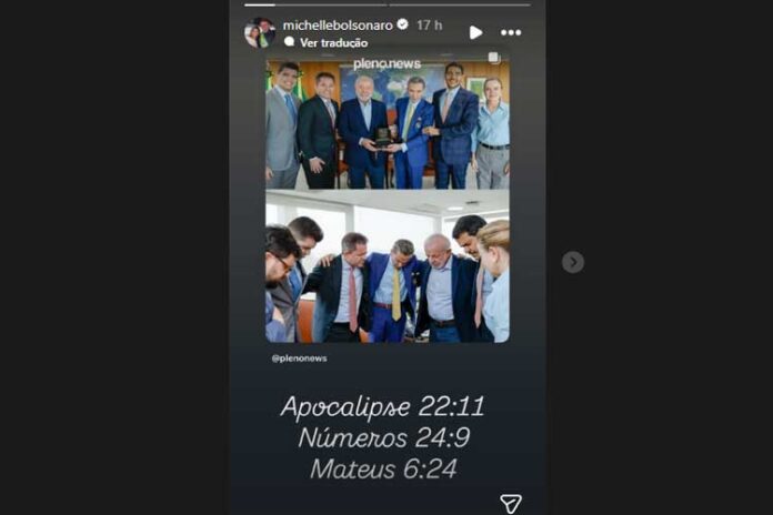 A esposa de Jair Bolsonaro repostou em seu perfil o registro e citou o versículo de Mateus que diz o seguinte: “Ninguém pode servir a dois senhores, pois amará um e odiará o outro, ou será fiel a um e desprezará o outro – Mateus 6:24”, publicou Michelle.