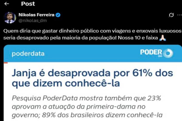 O deputado Nikolas Ferreira (PL-MG) criticou a primeira-dama Janja da Silva em post compartilhado em seu perfil no X (antigo Twitter). Compartilhando uma recente pesquisa, ele fez críticas a esposa de Lula.
