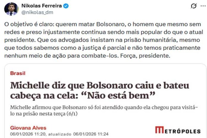 O deputado federal Nikolas Ferreira (PL-MG) usou o seu perfil no X (antigo Twitter) para desejar melhoras ao ex-presidente Jair Bolsonaro. Conforme publicado por Michelle Bolsonaro nesta terça-feira (06), o marido se sentiu mal e bateu a cabeça em móvel na Superintendência da Polícia Federal, em Brasília.