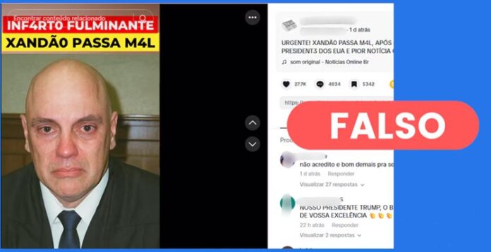 Está viralizando nas redes sociais que o ministro Alexandre de Moraes, do Supremo Tribunal Federal (STF), teria sofrido um infarto fulminante. A informação ainda destacava que Moraes teria sido atendido por um médico que teria constatado que o ministro tem problemas de saúde mental.