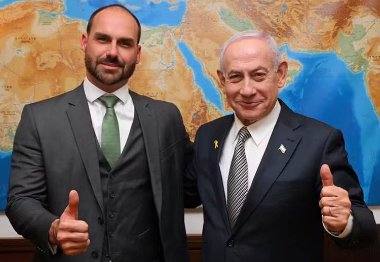 Na publicação de Eduardo com Netanyahu, os dois posam juntos, e a legenda faz referência a uma passagem bíblica. “Quem abençoar Israel será abençoado e quem amaldiçoar será amaldiçoado”, escreveu o parlamentar, com traduções para o inglês e também para o hebraico, língua oficial de Israel.