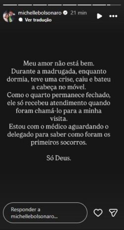 “Meu amor não está bem. Durante a madrugada, enquanto dormia, teve uma crise, caiu e bateu a cabeça no móvel. Como o quarto permanece fechado, ele só recebeu atendimento quando foram chamá-lo para minha visita”, revelou Michelle, em sua conta do Instagram, logo após visitar o marido na prisão.