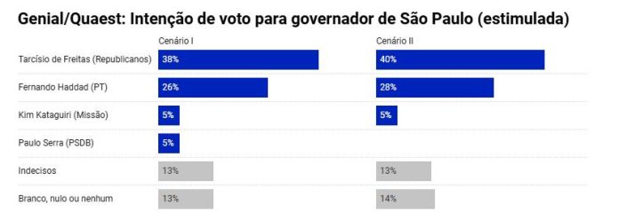 Divulgada nesta manhã de quarta-feira, 29 de abril, uma nova pesquisa feita pelo instituto Genial/Quaest sobre o cenário eleitoral de São Paulo mostra que Tarcísio de Freitas (Republicanos) lidera as intenções de voto para o governo do Estado tanto no primeiro quanto no segundo turno.