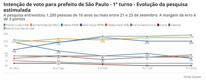 - Ricardo Nunes (MDB): 25% (eram 24% na pesquisa do dia 18 de setembro)