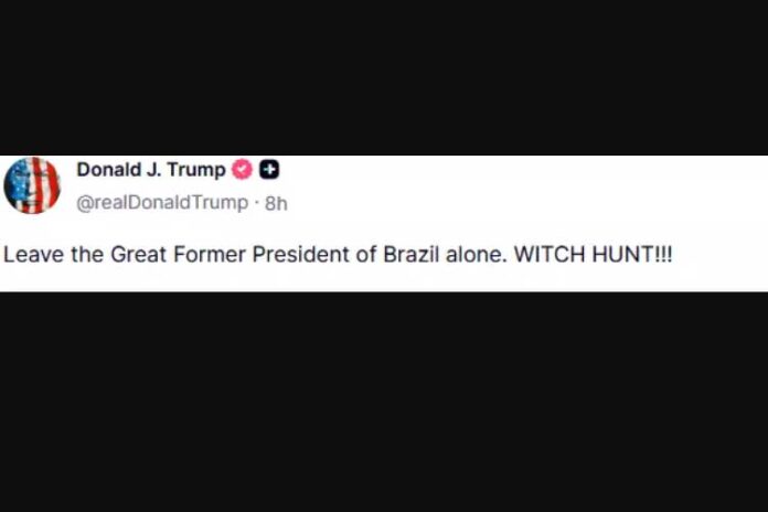 O republicano chamou as investigações contra o marido de Michelle Bolsonaro de “caça às bruxas”, pedindo ainda para que o deixem em paz. “Deixem o Grande ex-presidente do Brasil em paz. CAÇA ÀS BRUXAS!!!”, disse o presidente dos Estados Unidos na Truth Social.