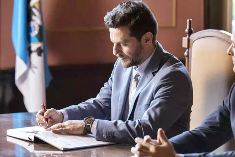 Em A Força do Querer, Caio (Rodrigo Lombardi) se torna secretário de segurança pública. A posse do advogado é transmitida pela TV.
