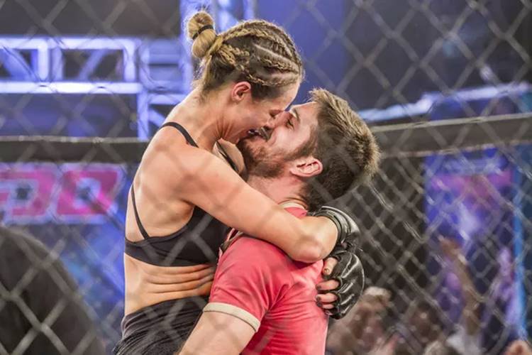 Jeiza sobe na grade e dedica à vitória ao caminhoneiro. Ao sair do octógono, a loira corre até o gato e eles se beijam!