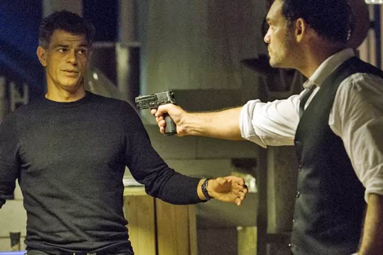 O criminoso logo fica com a pulga atrás da orelha e, assim que o marido de Nelita (Bárbara Paz) reaparece, ele aponta uma arma para o cara: “Você trabalhava para ele, né? E está traindo a facção. Por que você não me falou, não abriu o jogo?”.