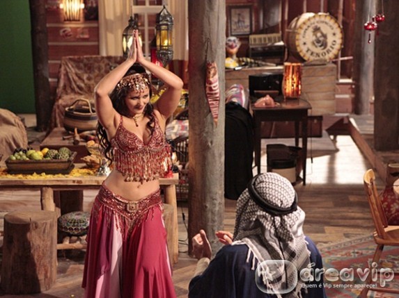 De repente, a odalisca tira o véu do rosto e se revela, linda. Glorinha (Maria Joana Chiappetta) e Nancy (Mariana Rios) tapam os olhos de Neca (Emílio Orciollo Netto) e Pimpinela (Nando Cunha), que babam pela futura esposa do amigo.