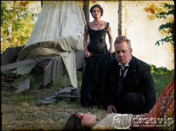De repente, a porta se abre com o forte chute de Zóio-Furado (Tuca Andrada). Timóteo e Açucena se assustam, mas o cangaceiro mostra que está ali para salvá-la e ordena: “Solte a moça!”.