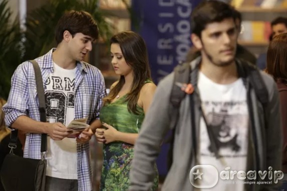 Cansada do chove não molha de André, a estudante solta na lata: “Perto, mas não perto demais, certo? Já entendi”, diz ela, dando as costas para André e já engatando um papo com Lucas, que pede ajuda com um trabalho da faculdade. Ih… André está perdendo território!