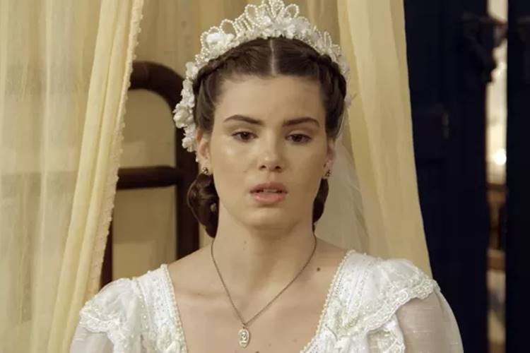 Nem mesmo quando estiver experimentando o vestido de noiva, Mafalda (Camila Queiroz), deixará o assunto do “cegonho” entre ela e Eponina (Rosi Campos) de lado.