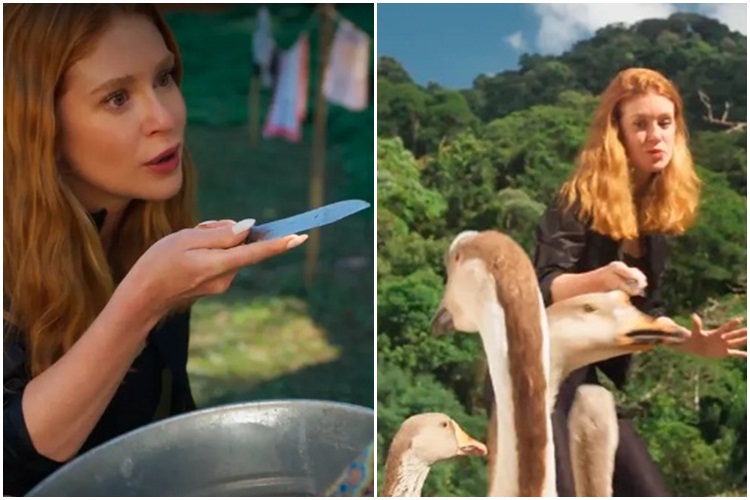 Apavorada, a dondoca começa a gritar. “Mantenha esses monstros longe de mim! Não gosto de quem tem bico! Não confio em quem tem pena!”, dispara. As aves começam a correr atrás de Preciosa, que fica ainda mais desesperada.