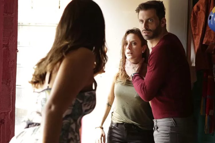 “Se você não soltar ela, eu vou quebrar o seu braço”, ameaça a esposa de Ben (Maurício Destri). Gabo pede para que ela não se meta, mas Mari o enfrenta. Ele então solta Ximena e segura Mari com força. “Agora é entre mim e essa favelada”, diz ele, jogando-a com força no chão em seguida.