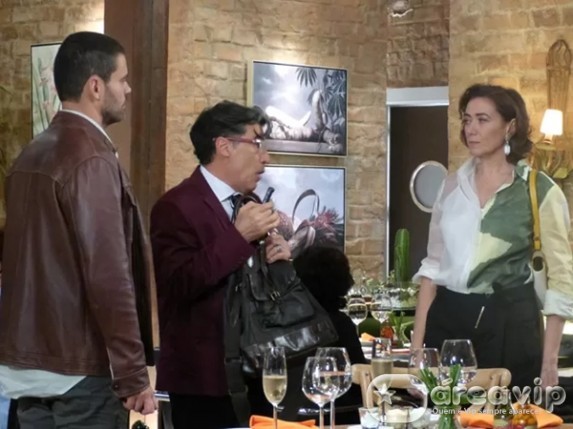 Ao descobrir a falcatrua de Maurílio, o casal começa a discutir. Téo, que não é bobo nem nada, grava tudo. Só que a aristocrata é mais esperta, toma o gravador do blogueiro e ainda pisa em cima do aparelho.