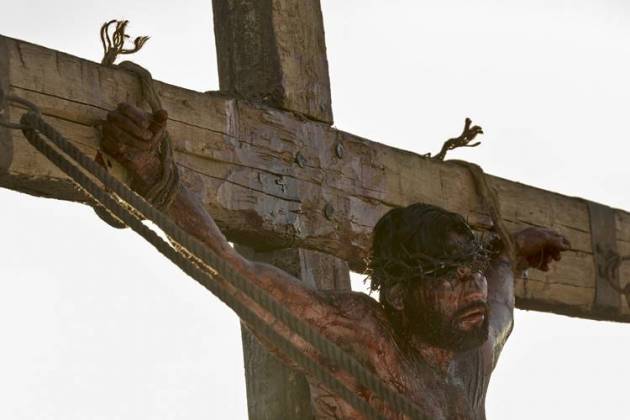 Em Jesus, após sua condenação, Jesus (Dudu Azevedo) é obrigado a carregar a própria cruz até a colina de Gólgota. Ferido e exausto, o Filho de Deus é pregado na cruz pelos soldados romanos, de maneira cruel. Longinus (Sacha Bali) ergue a cruz com o Messias pregado nela.