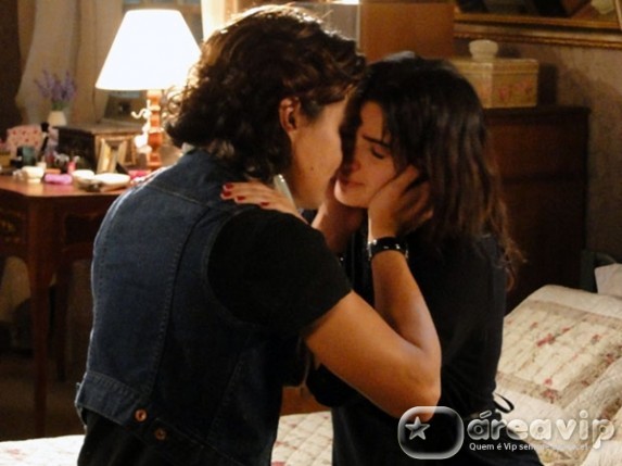 Áureo faz de tudo para levantar o astral da amiga. ““Você não é meu gênero, mas se fosse, eu te acharia o máximo!”, diz Áureo, dando um abraço apertado em Celeste.