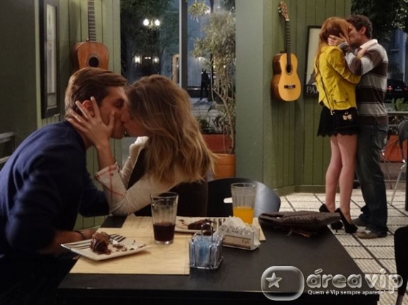 Alice está saindo do café, mas se detém ao ver os dois se beijando. “Ele nunca me beijou assim!”, dispara. A jovem acaba concluindo que o ex-namorado quer se mostrar para ela e tenta dar o troco. “Renato! Você está convocado para um beijo. E tem que ser já”, exige. Renato hesita, mas acaba cedendo ao pedido da namorada.