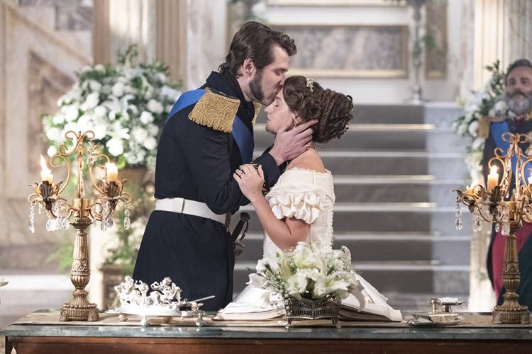 Finalmente está chegando o dia do casamento de Leopoldina (Bruna Griphao) e Augusto (Gil Coelho) em ‘Nos Tempos do Imperador’, em cenas previstas para irem ao ar neste sábado (20). A noiva, que não se cansa de fazer perguntas sobre a tão esperada noite de núpcias para a irmã, Isabel (Giulia Gayoso), está ansiosa para saber como será a vida de casada ao lado de seu amor, o homem que escolheu ter ao lado. Em conversa com a mãe, a imperatriz Teresa Cristina (Leticia Sabatella) elas se emocionam ao relembrar o forte vínculo que possuem. E, enquanto a celebração de casamento acontece, Solano López (Roberto Birindelli) invade o Mato Grosso com sua tropa paraguaia e declara guerra contra o Brasil.