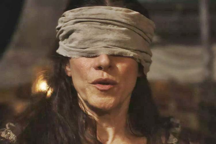 Ao ser levada sem que ninguém mais veja, nem ela mesma, sua venda é retirada. E a primeira pessoa que a portuguesa encara é Jacinto (Babu Santana).
