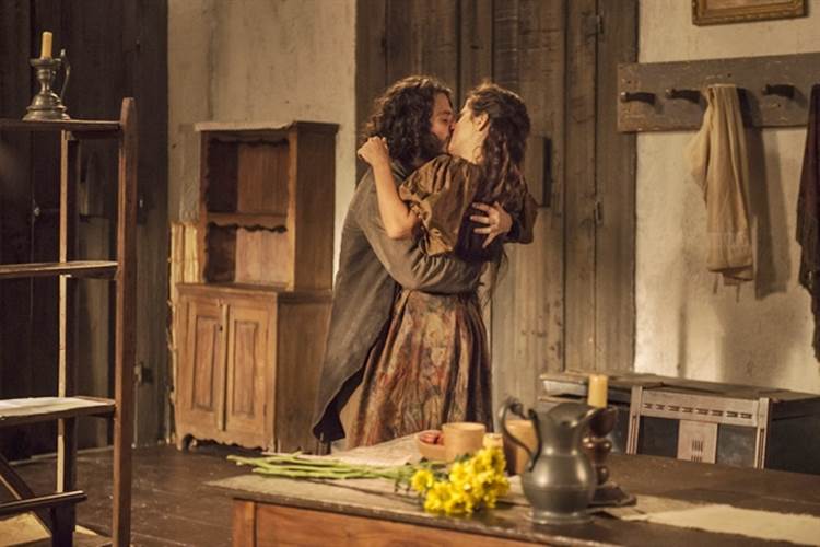 Ao chegar à casa da amada, lhe entrega uma flor. Como sempre faz, Elvira finge que não gostou, mas, no fundo, ama a atitude do rapaz e fica encantada. “Uma flor?! Vivo a receber! À grande atriz, flores e aplausos! Mas como sou magnânima, fiz uns petiscos para comermos!”, fala. Sua felicidade dura pouco, pois logo se lembra de Quinzinho. Hugo percebe e ressalta que é capaz de qualquer coisa para fazê-la feliz. Prontamente, a atriz pede que ele seja a plateia dela, avisa que vai apresentar um espetáculo teatral, e para ficar ainda melhor, o convida para fazerem a cena juntos. “Achou que ia te deixar de fora?! Percebi seus interesses, danadinho! Vamos contracenar! Estarás em cena com a diva, de igual para igual… Jamais! Porém, interpretando uma cena de amor!… Por que?! Por que me censurais o amor?! Me censurais… o amor…?! Ou não?!”. E é durante a fala de Elvira que Hugo não resiste e a beija.
