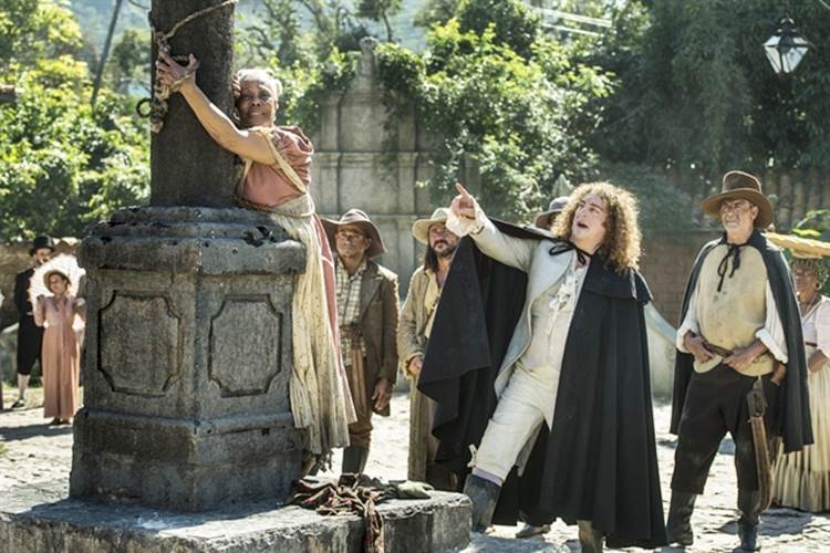 Furioso, Sebastião corre para casa e culpa Idalina (Dhu Moraes) por ter permitido o casamento entre os dois. Sem nenhuma piedade, arrasta a escrava para o tronco e causa um burburinho na cidade. “Você nunca soube o que é um tronco! Esse foi o meu erro! Mas agora você vai saber!”. Ela se desespera e tenta sair da situação cruel. “Não faz isso, seu Sebastião… não me castiga… o senhor nunca me bateu, eu sou uma velha…”. Matias (Renan Monteiro) corre para ajudar a mãe e sugere ser colocado no tronco no lugar dela. “Não vou deixar ninguém bater na minha mãe! Ela não teve culpa de nada. Se quer descontar em alguém, bate em mim”.