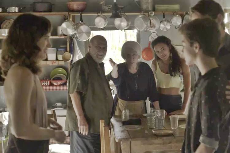 Ao chegarem na porta da casa de Mercedes (Fernanda Montenegro), Tomaz fica intrigado: “Aqui? O que tem aqui?”