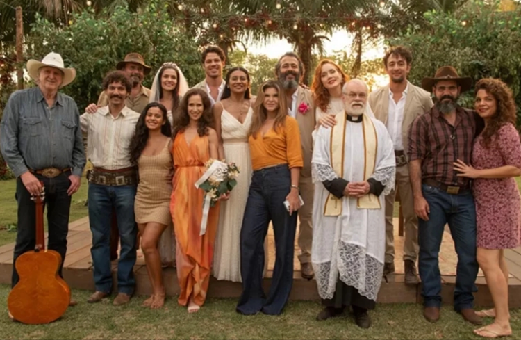 Na festa, que reuniu grande parte do elenco, Maria Bruaca (Isabel Teixeira) e Alcides (Juliano Cazarré) estavam ali juntinhos, celebrando o amor e a vitória depois de tantas batalhas e sofrimento.
