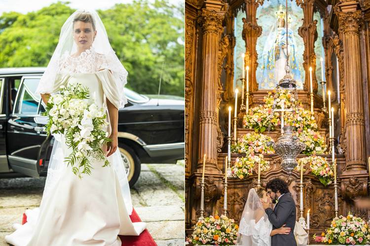 Já a figurinista Marie Salles conta detalhes sobre a escolha do vestido usado por Madeleine. “O vestido da Madeleine é do Carlos Bacchi, designer de Porto Alegre que está fazendo sucesso entre as noivas no Brasil. Ele foi muito querido e me cedeu esse vestido que pertence ao ateliê dele. Quando comecei a procurar o vestido, queria um modelo ombro a ombro e justo, sexy, mas que ao mesmo tempo marcasse a época, e que também marcasse a personalidade da Madeleine. Acho que esse vestido caiu como uma luva. Como é um casamento tradicional, tem o véu, a mantilha cobrindo o rosto com uma coroa de brilhantes”, conta.