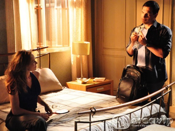 Clara (Mariana Ximenes) está deitada na cama, quando Diogo (Daniel Boaventura) chega com novidades. Mas antes que ele diga alguma coisa, a loura reclama com o amante: