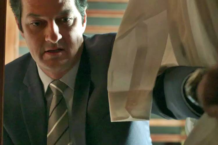 O homem vasculha todo o apartamento atrás das provas contra Eric (Mateus Solano) que Arlete (Elizabeth Savala) havia escondido em um chapéu.