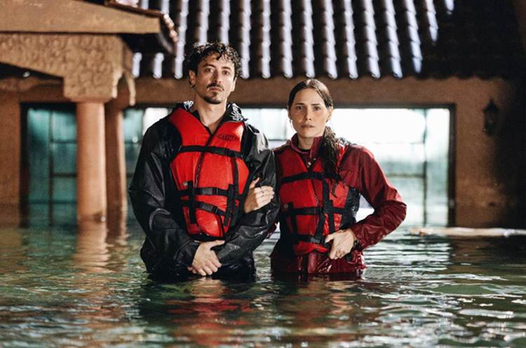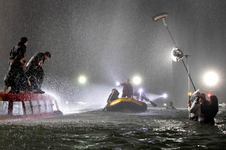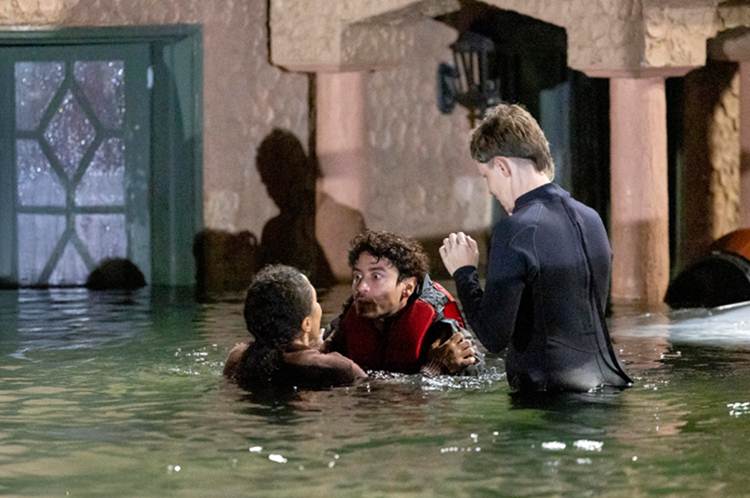 Em um lago artificial de 13 mil metros quadrados, foram construídas três casas cenográficas projetadas para reagir à força da água. As cenas foram produzidas a partir da integração entre efeitos práticos em ambiente controlado e cenários virtuais, permitindo que tudo o que aparece em cena fosse captado com realismo e segurança.