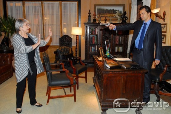 Beatriz (Íris Bruzzi) conversa com Nicolau (Heitor Martinez) sobre a morte de Érico (Henrique Martins), o pai do senador. Impaciente com a insistência da mãe, Nicolau tira uma arma da gaveta e a descarrega, deixando apenas uma bala no tambor para fazer roleta russa. Ele aponta o revólver para a própria cabeça e aperta o gatilho, mas a arma não dispara. O senador então aponta o revólver para Beatriz, que entra em pânico. Antes de apertar o gatilho ele aponta em outra direção e sua mãe desmaia.