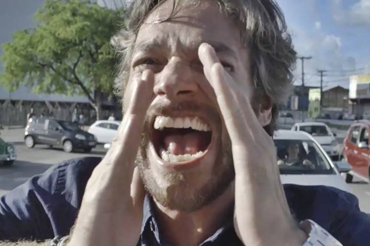 Beto corre no meio dos carros para alcançar Luzia. A DJ entra em um ônibus e Beto corre atrás do veículo.
