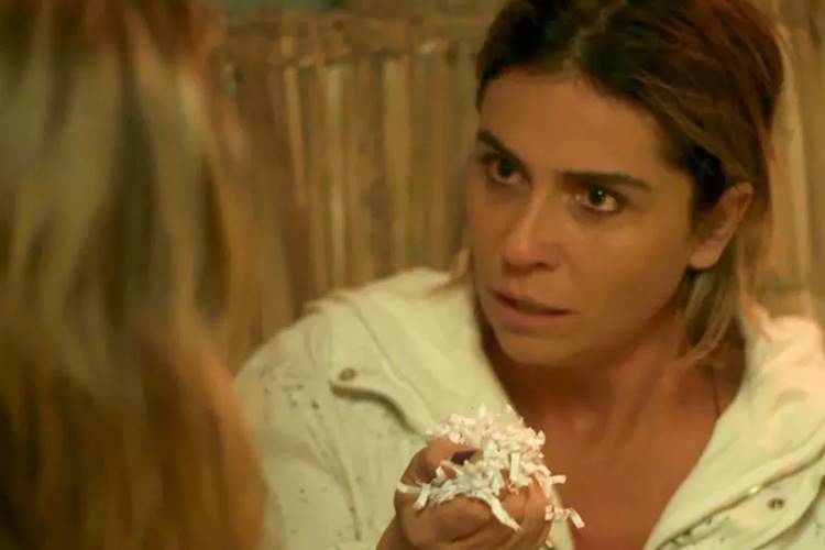 Ela jura para o amigo que não matou Remy (Vladimir Brichta) e mostra o interior da mala que levou no encontro com o pilantra: “Tá aqui a prova! Eu levei aquela dinheirama toda pra entregar ao Remy e olhe: só tem papel picado e alguns maços de dinheiro que eu mesma botei aqui, que estavam em cima da cama! Alguém teve naquele quarto depois que eu apaguei!”