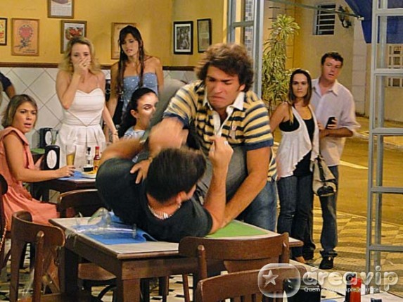 Luti vê a cena revoltado e parte para cima. Pedro cai em uma mesa, e o estudante ainda joga um copo de bebida na cara dele.