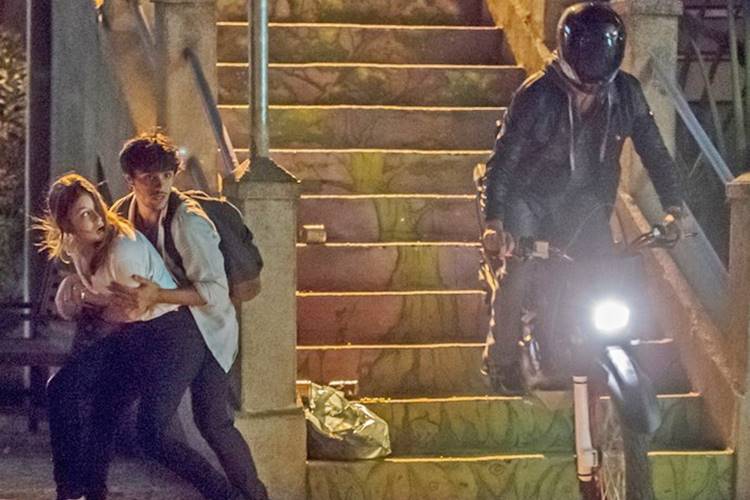 De repente, Jonatas percebe uma moto se aproximando de Eliza. Jacaré (Sérgio Malheiros), do outro lado da rua, se esconde com o capacete e tenta atropelar a filha de Germano (Humberto Martins). O bandido só não esperava ver seu antigo rival tão perto. O ex-vendedor de balas não pensa duas vezes e corre para salvar sua ruivinha. Enquanto isso, Leila fica falando sozinha ao telefone.