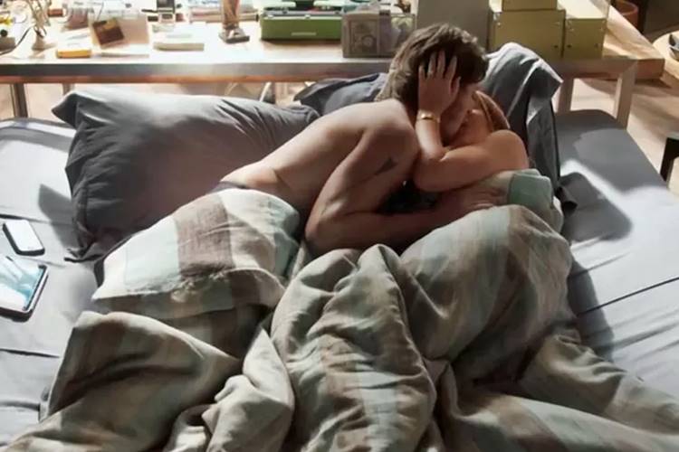 Apaixonados, os dois se beijam e vão para a cama.