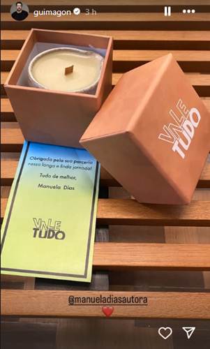 Manuela enviou um pacote com o nome da novela e com uma vela aromática para agradecer pelo trabalho de Magon na trama. “É uma lembrancinha da Manu agradecendo a parceria nessa jornada. Manu, eu que agradeço. A gente conseguiu contar essa história muito forte de um jeito muito bonito. Obrigado”, disse ele.