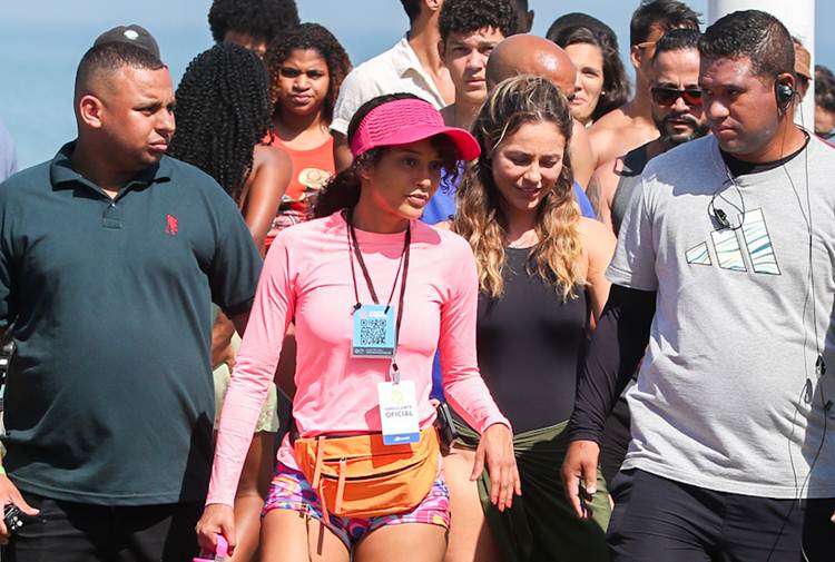 Taís Araújo gravou cenas em que Raquel volta a trabalhar vendendo sanduíche na praia. Paolla Oliveira e Malu Galli também participaram da sequência. As atrizes chamaram a atenção dos banhistas.