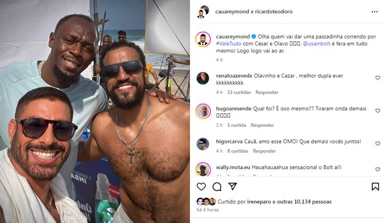 Bolt interagiu com os atores e participou de uma selfie para registrar o encontro. Nas redes sociais, Reymond compartilhou a foto e celebrou a participação do jamaicano. “Olha quem vai dar uma passadinha correndo por #ValeTudo com César e Olavo. @usainbolt é fera em tudo mesmo! Logo logo vai ao ar”, escreveu o ator na legenda do post.