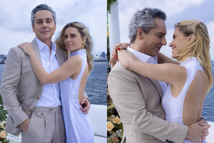Em cenas previstas para irem ao ar na próxima segunda-feira (15/09), os dois embarcam com os filhos, Tiago (Pedro Waddington) e Bruno (Miguel Moro) em um barco luxuosamente decorado para a ocasião. A cerimônia íntima acontece em alto-mar com Leila radiante em seu vestido de noiva, feito por Eunice (Edvana Carvalho).